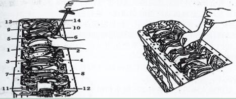 (5) 裝主軸承蓋參見圖2-3-8的要求安裝,并用銅錘敲到位。主軸承蓋螺栓螺牙上可加適量機油,并用手自由擰入幾牙。用扭力板手分三次由中間向兩端緊固。如圖2-4-9。