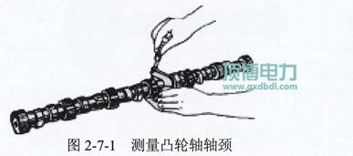(1)測量凸輪軸軸徑,各機型凸輪軸徑規定值見表2-7-1。測量方法見圖2-7-1。